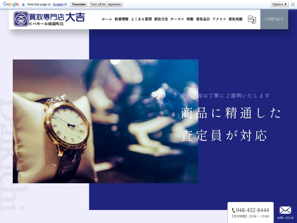 | 買取専門店大吉ビバモール蕨錦町店 | 幅広いジャンルに対応し、専門鑑定士が在籍 | ブランド品、貴金属、時計、家電 | 〒335-0005 埼玉県蕨市錦町1丁目12−1 ビバモール蕨 2階 |
